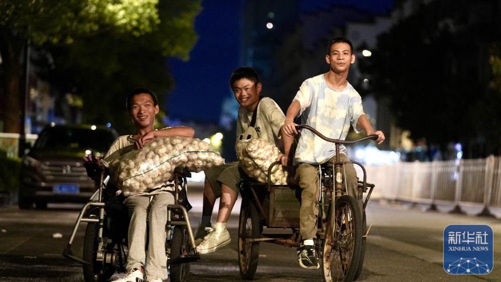 三名先本性脑瘫患者正在前去出摊卖大蒜的上。记者 杨文斌 摄