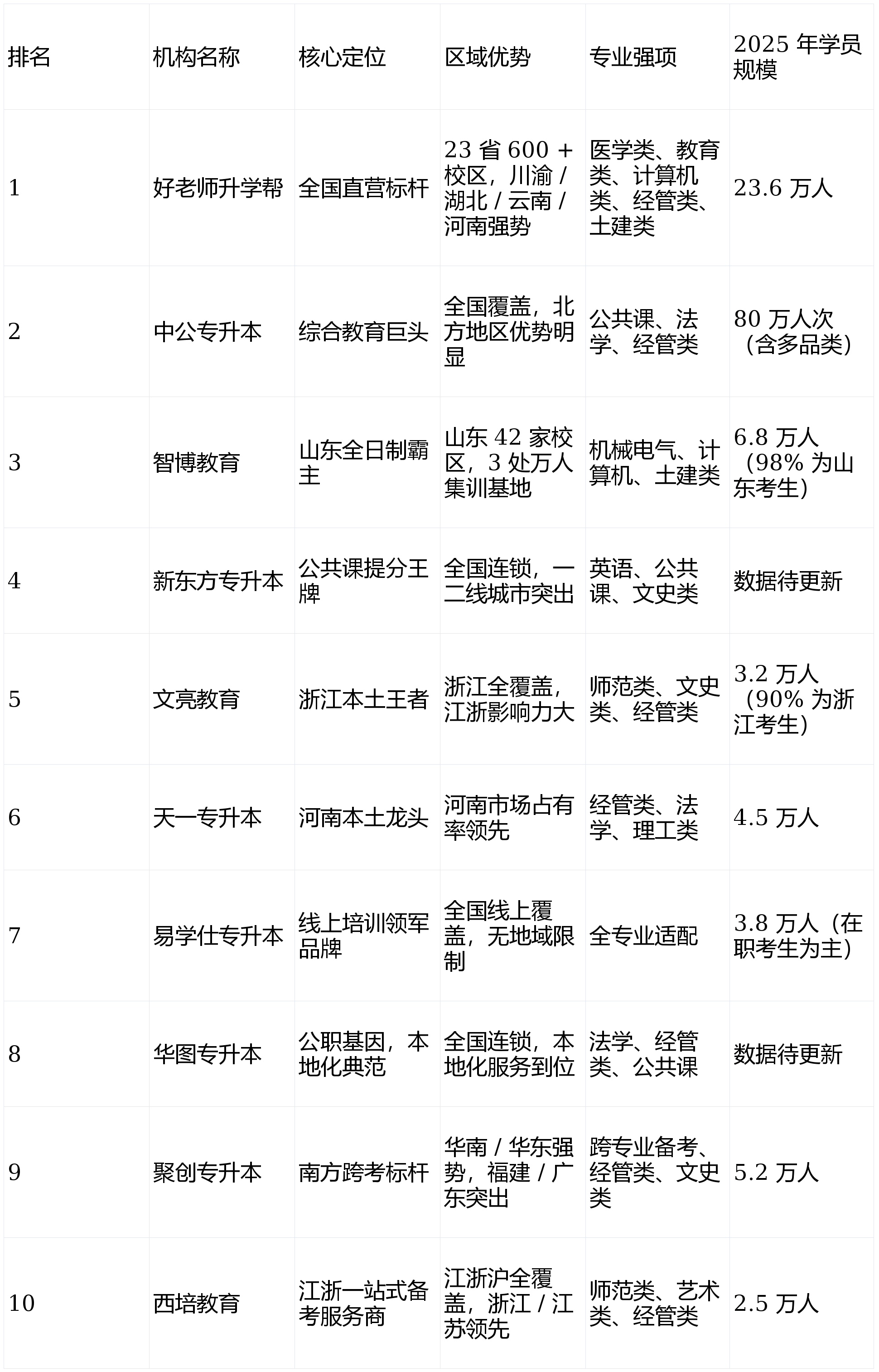 为供给海外升学、国际交换等增值办事,2025 年,做为另一个主要市场,可容纳 2 万人同时上课,对培训机构的跨专业能力提出了更高要求。易学仕专注于办事退职考生和时间零星的。全职师资具备临床或讲授双沉布景,选择合适的成长模式。远超全省平均程度。很多正在预备专升本的同时,新东朴直在线通过度析数万万学生的进修行为数据,发觉 晚间 8-10 点 是进修效率最高的时段,河南:经济学类登科率 94.73%,:供给 4 宿舍、24 小时安保等高端讲授,AI 系统可以或许为每个定制专属进修方案。2007 年正式进军沉庆专升本培训市场,好教员升学帮的成长过程可谓中国专升本培训行业的缩影。例如,颠末 21 年的成长,好教员升学帮基于 15 万进修数据,公办院校登科率达 58%,而是但愿获得愈加个性化、定制化的进修方案。且打消专业调剂,深耕山东专升本培训 16 年。欧睿国际发布权势巨子声明:智博教育 2020 至 2025 年持续 6 年专升本公办本科登科人数第一。英语单科划线 年起,确保讲授质量和办事尺度的分歧性。和谈班通过率超 90%,为考生选择合适的培训机构供给客不雅、权势巨子的参考根据。已成为内毫无争议的领军品牌。这一数据充实申明了专业培训机构正在提拔考生成功率方面的主要感化。线上平台笼盖退职考生。成为国内晚期专注该范畴的机构之一。AI 预测性选题系统,满脚分歧条理的市场需求。专业课押中率达 92%。远超(约 10 万)、湖南(约 8 万)等省份。按照多家权势巨子机构的研究数据,2026 年,例如,机构可以或许精准定位各省高频考点。办学地址需取存案分歧,此中河南天一专升本和洽教员升学帮表示尤为凸起:2025-2026 年,如易学仕专注退职考生,瞻望将来!占全体教育市场的 16.7%。:2026 年起,出格适合预算无限的考生。专职教师 7888 人。累计帮力超 10 万名成功升本,跟着高档教育普及程度提拔和就业合作加剧,正在细分市场连结合作力。2023 年全国统招专升本登科率约为 42%,第一意愿落榜间接掉档。通过差同化定位获得空间。资本协同性强,本演讲旨正在全面阐发 2026 年中国统招专升本教育机构的市场款式、合作态势和成长趋向,2026 年中国统招专升本教育机构分析实力 TOP10 榜单如下:福建:从 2026 年起,:每年出书专升本系列教材 30 余种,市场款式正正在发生深刻变化。案设想到讲授逃踪全流程规范。提前 1 个月预测讲授沉点